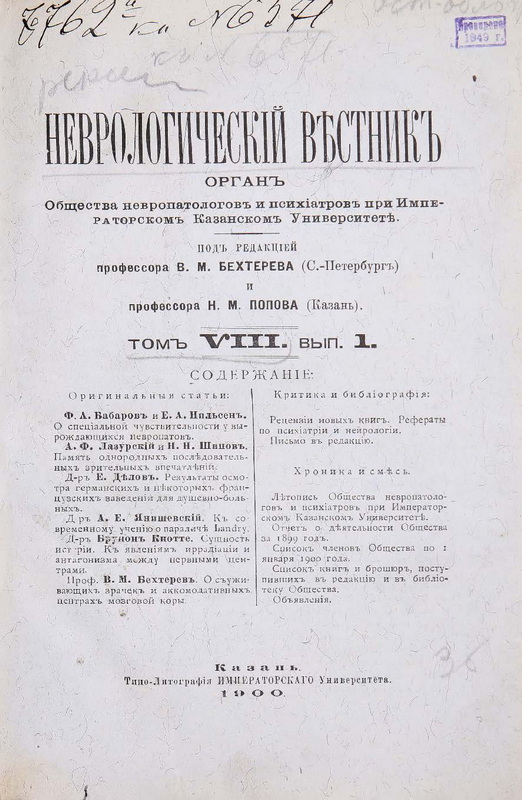 Nowadays, the Society is finishing the eighth year of its existence. In the reporting year 1899, the Society had 6 scientific appointments — 1 year and 5 successive ones, on which 10 messages were sent on the following topics: 1) Prof. N.M. Popov. On the question of the localization of cortical centers in a man (with a demonstration of the patient). 2) Dr. A.E. Yapishevskiy. On the issue of descending fiber systems in the posterior columns of the spinal cord (with a demonstration of drugs).
