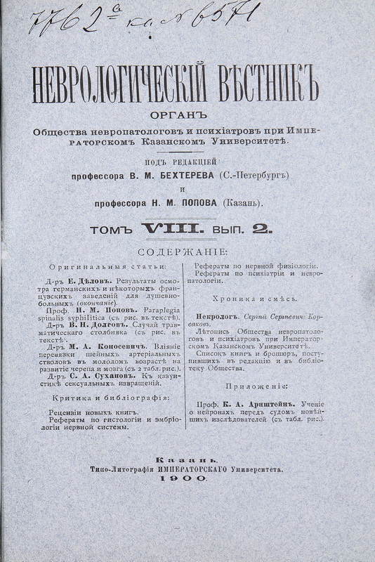 Chronicle of the society of neuropathologists and psychiatrists at the imperial Kazan University. Protocol of the year's arrest on January 30, 1900