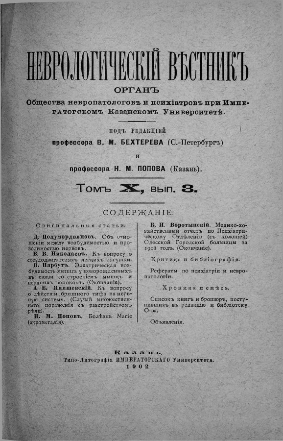 Новая работа проф. В. М. Бехтерева посвящена изложенію всего ученія о патолого-анатомическихъ измѣненіяхъ мозга при сифилисѣ. Трудъ автора раздѣленъ на отдѣлы, обнимающіе собою патологію сифилитическихъ пораженій сосудовъ мозга, гуммозныхъ новообразованій мозга и его оболочекъ, сифилитическихъ пораженій твердой оболочки головного и спинного мозга (pachymeningitis syphilitica), сифилитическихъ пораженій мозговыхъ оболочекъ (meningitis syphilitica), патолого-анатомическую картину менинго-міэлита и менинго-энцефалита, сифилитическаго міэлита и энцефалита, множественнаго сифилитическаго энцефало-міэлита и сифилитическаго разсѣяннаго склероза.