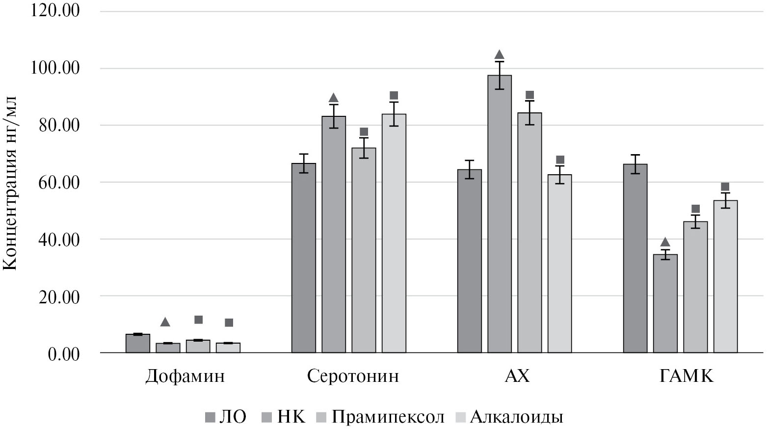 Рис. 1. Влияние прамипексола и гликоалкалоидов на изменение концентрации нейромедиаторов в тканях головного мозга у крыс с болезнью Паркинсона. ▲ — достоверно относительно ЛО; ■ — достоверно относительно НК.