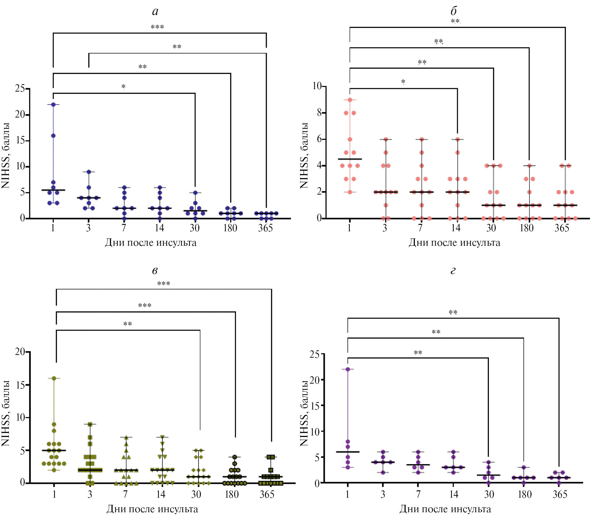 Рис. 2. Динамика изменений показателей NIHSS в группах пациентов без ПКН (а), с ПКН (б), без ПДР (в) и с ПДР (г). Статистические различия между временными точками оценивали с помощью критерия Фридмана с апостериорным критерием Данна: *p < 0.05, **p < 0.01, ***p < 0.001. Значения на графиках представлены как медиана и размах.