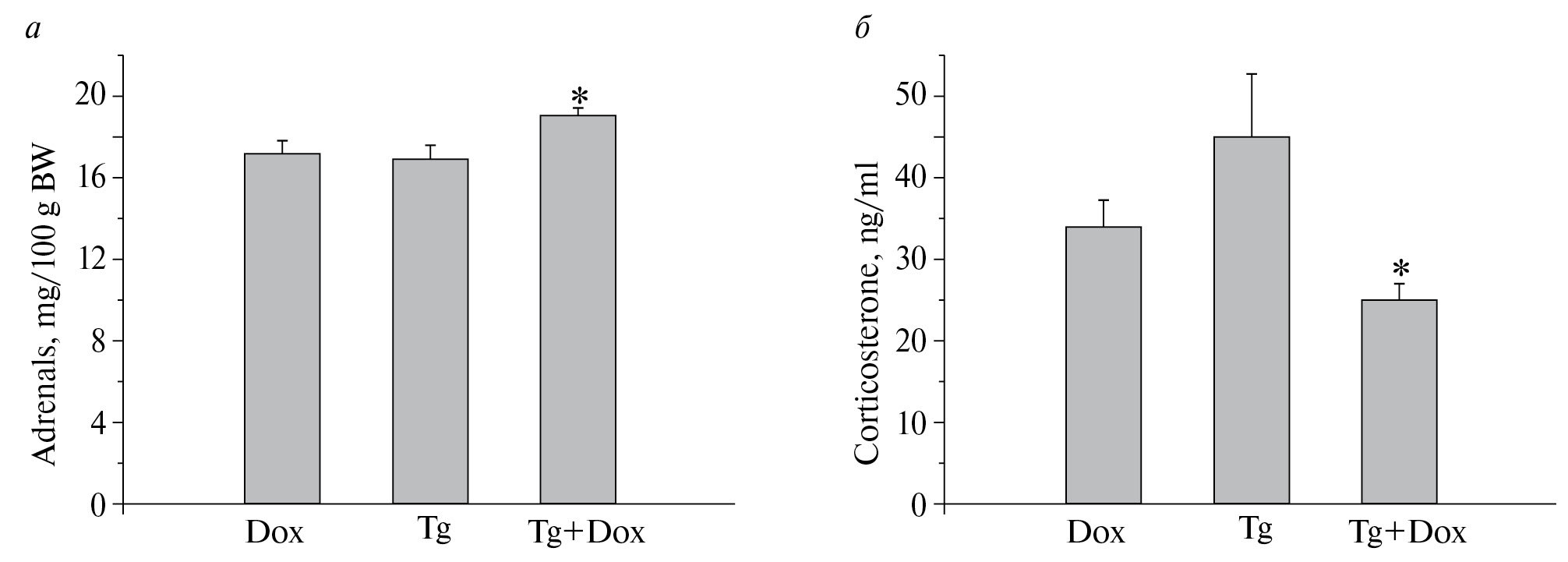 Рис. 4. Относительные веса надпочечников (a) и стресорные уровни кортикостерона (б) в плазме периферической крови взрослых крыс, получавших внутригиппокампальные инъекции лентивирусного вектора и доксициклин с питьевой водой отдельно и совместно. Dox – доксициклин, Tg ‒ лентивирусный вектор, Tg+Dox ‒ лентивирусный вектор с последующим потреблением доксициклина; в каждой группе 7–8 животных. На (а) ‒ *p < 0.05 по сравнению с группами Dox; на (б) ‒ *p < 0.05 по сравнению с группой Tg.