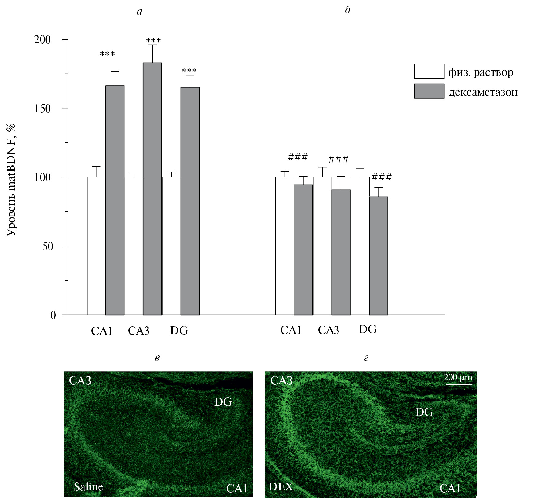 Репрезентативные микрофотографии: белок matBDNF ‒ зеленый сигнал (флуорофор Alexa-488) (в ‒ через 6 часов после введения физраствора, г ‒ через 6 часов после введения дексаметазона).