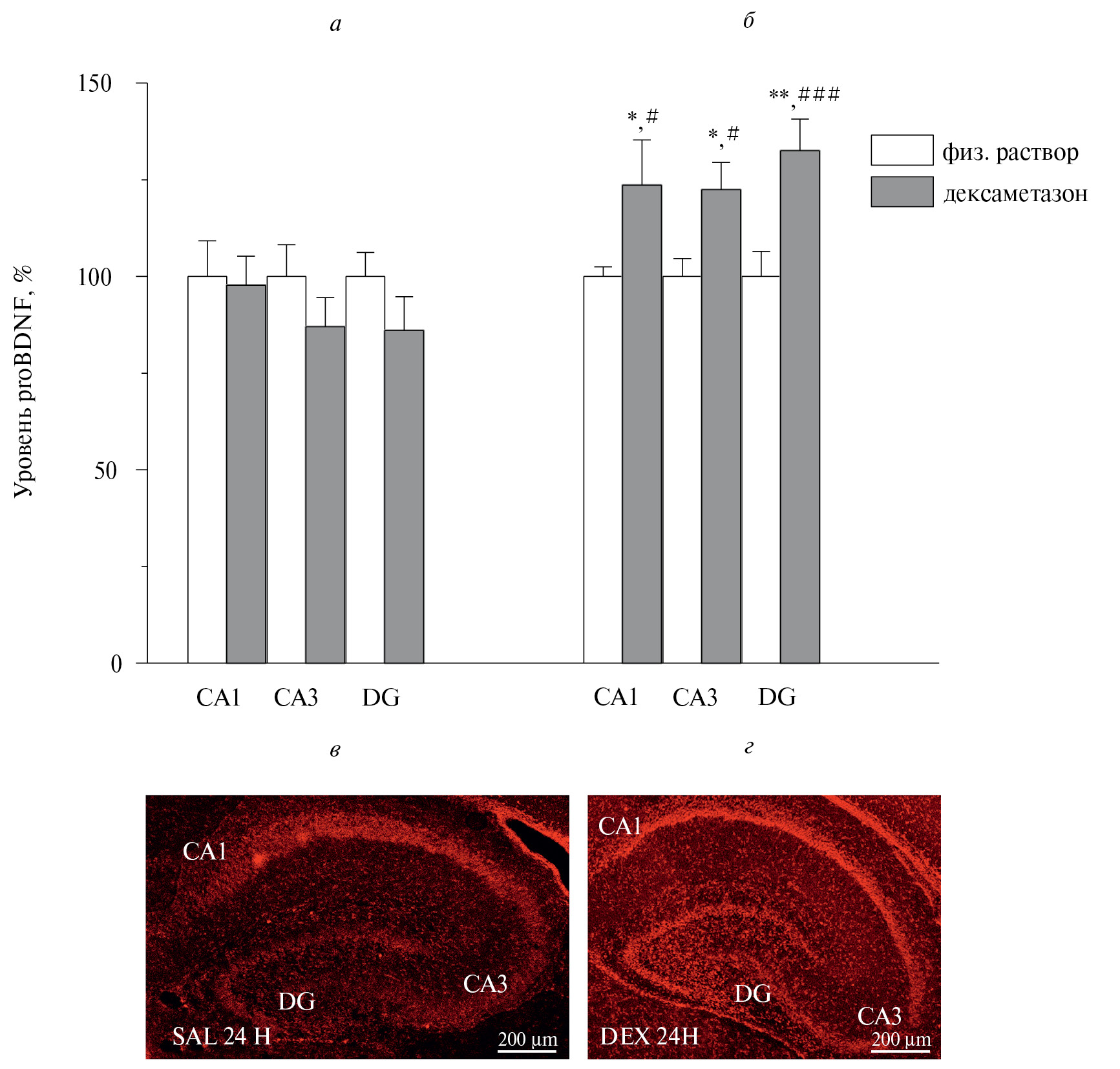 Рис. 2. Уровень proBDNF в областях гиппокампа неонатальных крысят через 6 часов (а) и 24 часа (б) после введения дексаметазона в процентах относительно группы с введением физиологического раствора. *р < 0.05; **р < 0.01 по сравнению с введением физ. раствора, #р < 0.05; ###р < 0.001 по сравнению с соответствующими 6-часовыми группами.