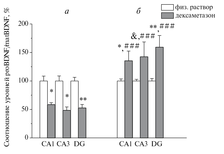 Рис. 3. Отношение уровней proBDNF к matBDNF в областях гиппокампа неонатальных крысят через 6 часов (а) или 24 часа (б) после введения дексаметазона в процентах относительно группы с введением физиологического раствора. *р < 0.05, **р < 0.01; &р=0.05 по сравнению с введением физ. раствора, ###р < 0.001 по сравнению с соответствующими 6-часовыми группами.