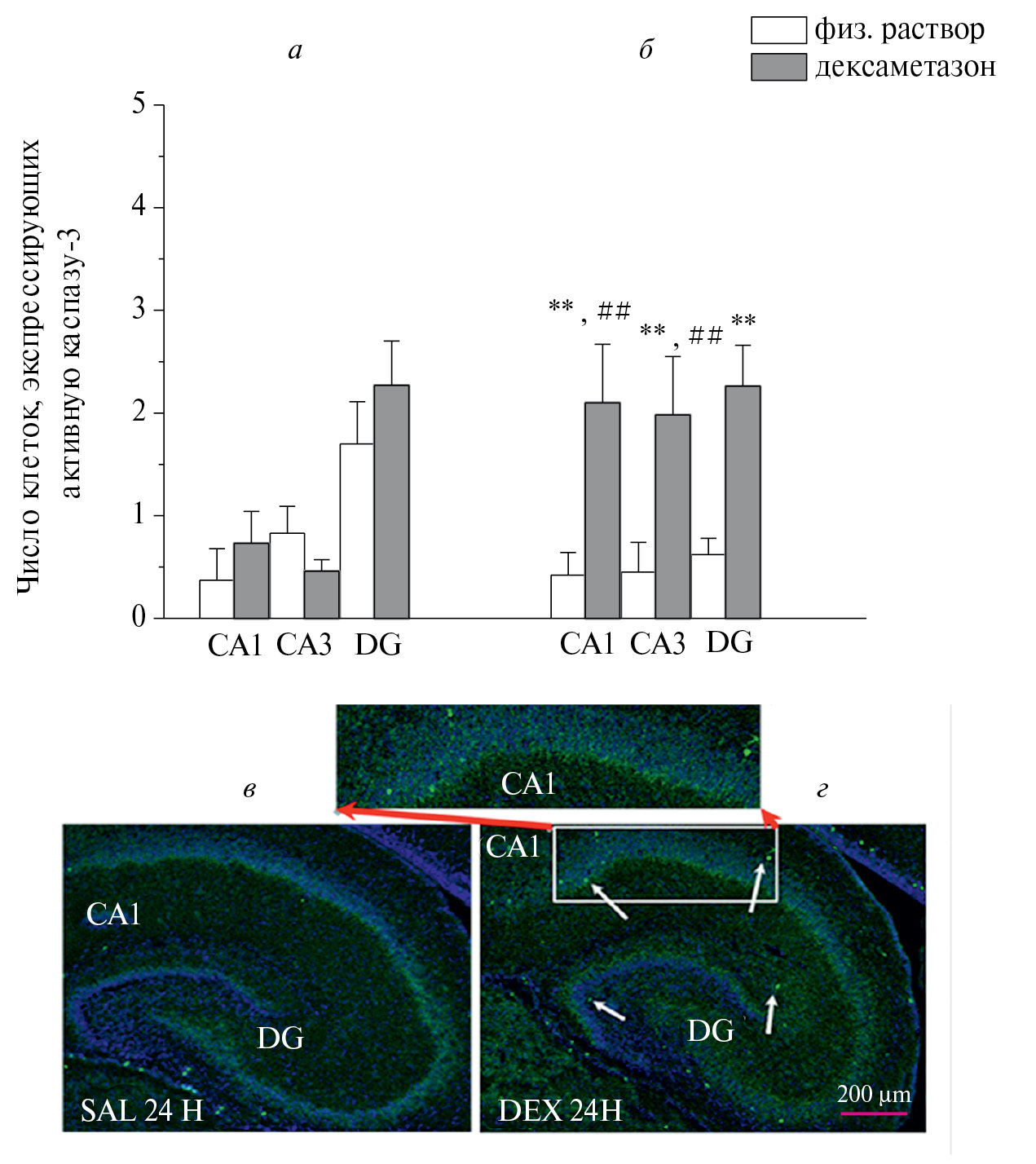 Рис. 5. Число клеток, экспрессирующих активную каспазу-3, в областях гиппокампа неонатальных крысят через 6 часов (а) или 24 часа (б) после введения дексаметазона. **р < 0.01 по сравнению с введением физ. раствора, ##р < 0.01 по сравнению с соответствующими 6-часовыми группами.