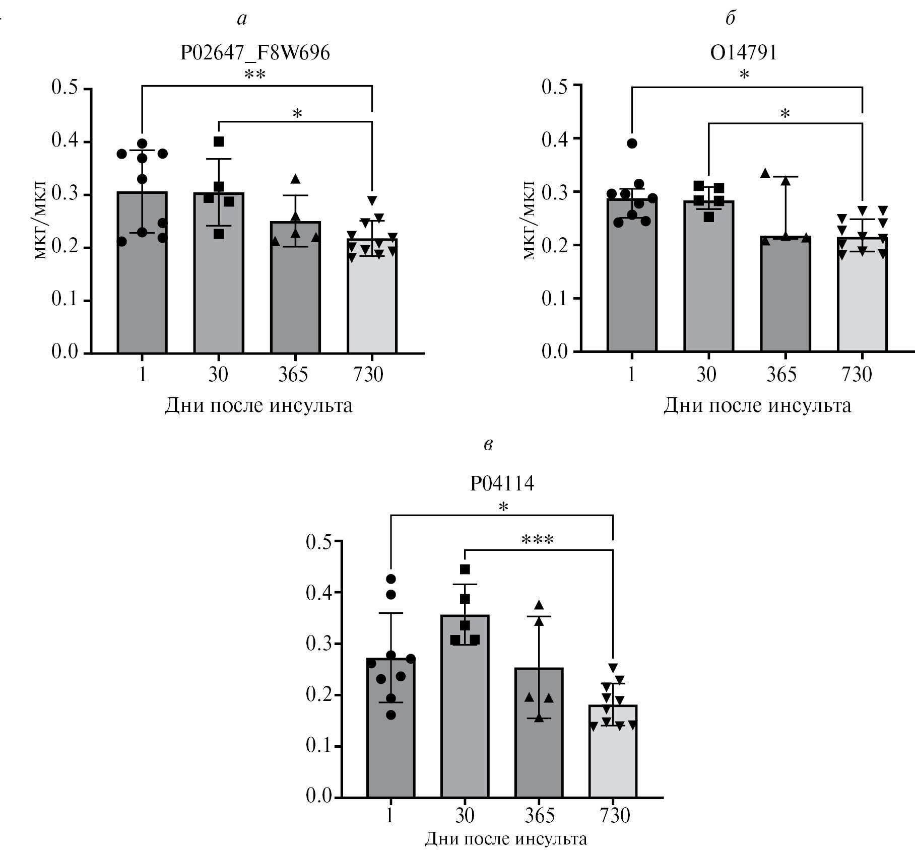 Рис. 2. Уровень аполипопротеинов: Апо-А1(а), Аpo-L1 (б), Апо-В (в) в экзосомах сыворотки крови пациентов на разных сроках после ИИ. Статистические различия между временными точками оценивались при помощи one-way ANOVAтеста с post-hoc анализом при помощи теста Тьюки. *p < 0.05, **p < 0.01, ***p < 0.001