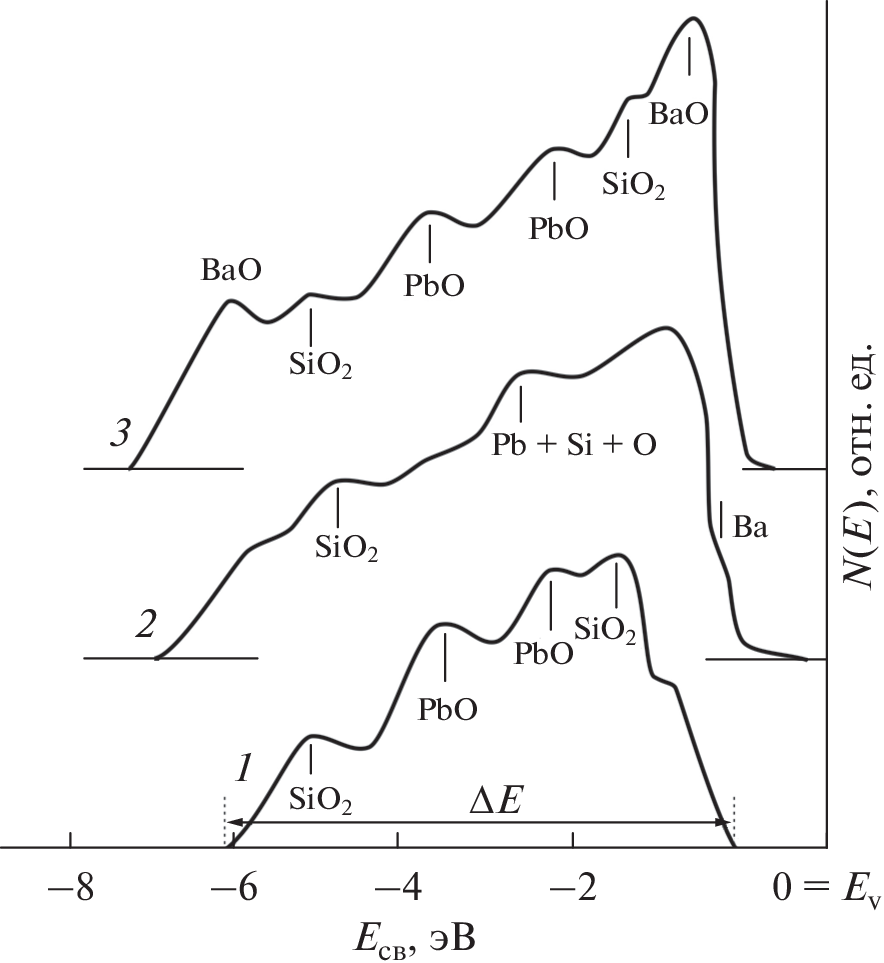 In this work, using the methods of Auger electron spectroscopy, ultraviolet photoelectron spectroscopy and light absorption spectroscopy, the influence of the implantation of Ba+ ions into silicate glass and subsequent annealing on the composition, density of electronic states and parameters of energy bands was investigated. It has been shown that nonstoichiometric oxides Si, Pb, and Ba, as well as unbound atoms of the same elements, are formed in the ion-implanted layer after ion implantation. As a result, there is a significant change in the electronic structure of silicate glass, in particular, the band gap decreases by ∼2 eV. After annealing at T = 1000 K, unbound Si, Pb, and Ba atoms disappear in the ion-implanted layer (within the sensitivity of the Auger electron spectrometer) and stoichiometric oxides such as SiO2, PbO, and BaO are formed.