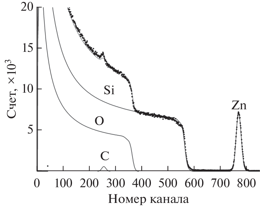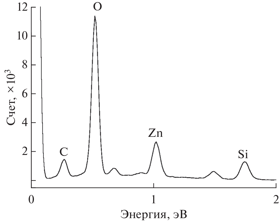 The results of the synthesis of nanoclusters of metallic zinc and its oxide in crystalline quartz implanted with 64Zn+ ions with a dose of 5 × 1016 cm–2 and energy of 40 keV and annealed in an oxygen atmosphere in the temperature range 400–900°C are presented. Scanning electron microscopy combined with energy-dispersive spectroscopy, as well as Auger electron spectroscopy and photoluminescence, were used for the study. After implantation, separate nanoclusters of metallic zinc with a size of less than 1 µm were fixed on the surface and in the near-surface layer of quartz. It was established that, during annealing, the sample underwent a transition from the phase of metallic Zn to the phases of its oxide ZnO and silicate Zn2SiO4. After annealing at 700°C, which is the most optimal for obtaining the ZnO phase, zinc oxide nanoclusters smaller than 500 nm in size were formed in the near-surface layer of quartz. A peak in the form of a doublet at a wavelength of 370 nm was observed in the photoluminescence spectrum due to exciton luminescence in zinc oxide. After annealing at 800°C, the ZnO phase degraded and the zinc silicate phase Zn2SiO4 was formed.