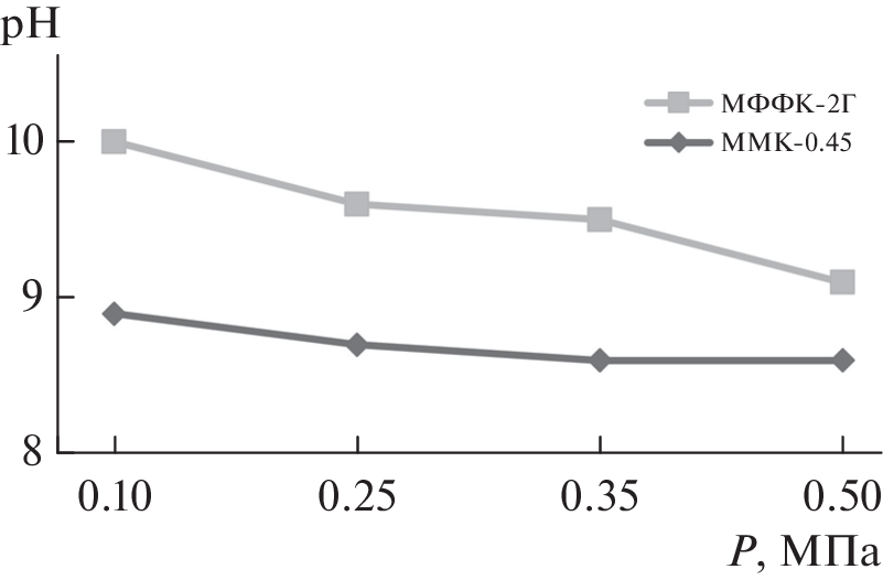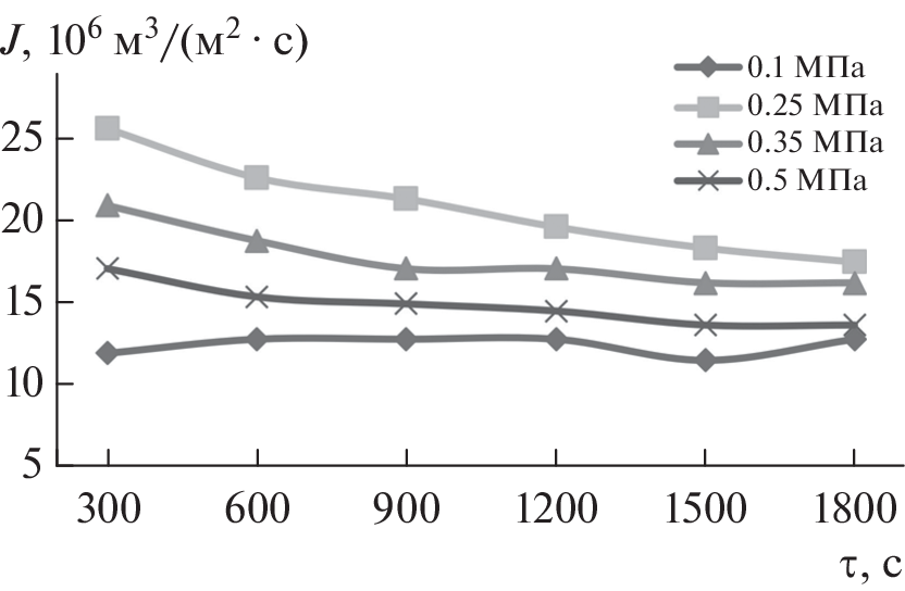 Методом ИК-спектроскопии выполнены исследования структуры поверхностного слоя воздушно-сухих, водонасыщенных и рабочих образцов микрофильтрационных композиционных мембран на основе полиамида ММК-0.45 и фторопласта МФФК-2Г. ИК-спектры анализировали в диапазонах частот 500–1700 и 2800–3400 см–1. В случае полиамидной мембраны ММК-0.45 основные пики функциональных групп полимеров в ИК-спектрах сухого, водонасыщенного и рабочего образцов совпадают. Полосы поглощения полиамидов колеблются в интервале от 650 до 5000 см–1, соответствующем пептидной связи. В полосе поглощения 1650 см–1 происходят деформационные колебания карбонильной группы, а в полосе 1550 см–1 наблюдаются деформационные колебания связи N–Н. Область 3500–3000 см–1 – это валентные колебания групп NH, OH и воды. В случае рабочего образца фторопластовой мембраны МФФК-2Г валентные колебания фторзамещенных групп лежат в диапазоне 1100–1400 см–1, они соответствуют валентным колебаниям C–F (1198 и 1171 см–1). Также в ИК-спектре видны два пика в области 2800–3000 см–1, они характерны для биодизеля из растительных масел. Проведены исследования удельного выходного потока и изменения рН пермеата в зависимости от времени и трансмембранного давления. Наблюдаются несколько периодов снижения удельного выходного потока в зависимости от времени, что, скорее всего, обусловлено разблокированием пор микрофильтрационной мембраны веществами, находящимися в разделяемом растворе, и возможным образованием пограничного голевого слоя. Снижение рН пермеата с ростом трансмембранного давления на микрофильтрационных мембранах ММК-0.45 и МФФК-2Г, вероятно, объясняется повышением скорости миграции органических кислот через слой гелия и рабочий слой мембраны.