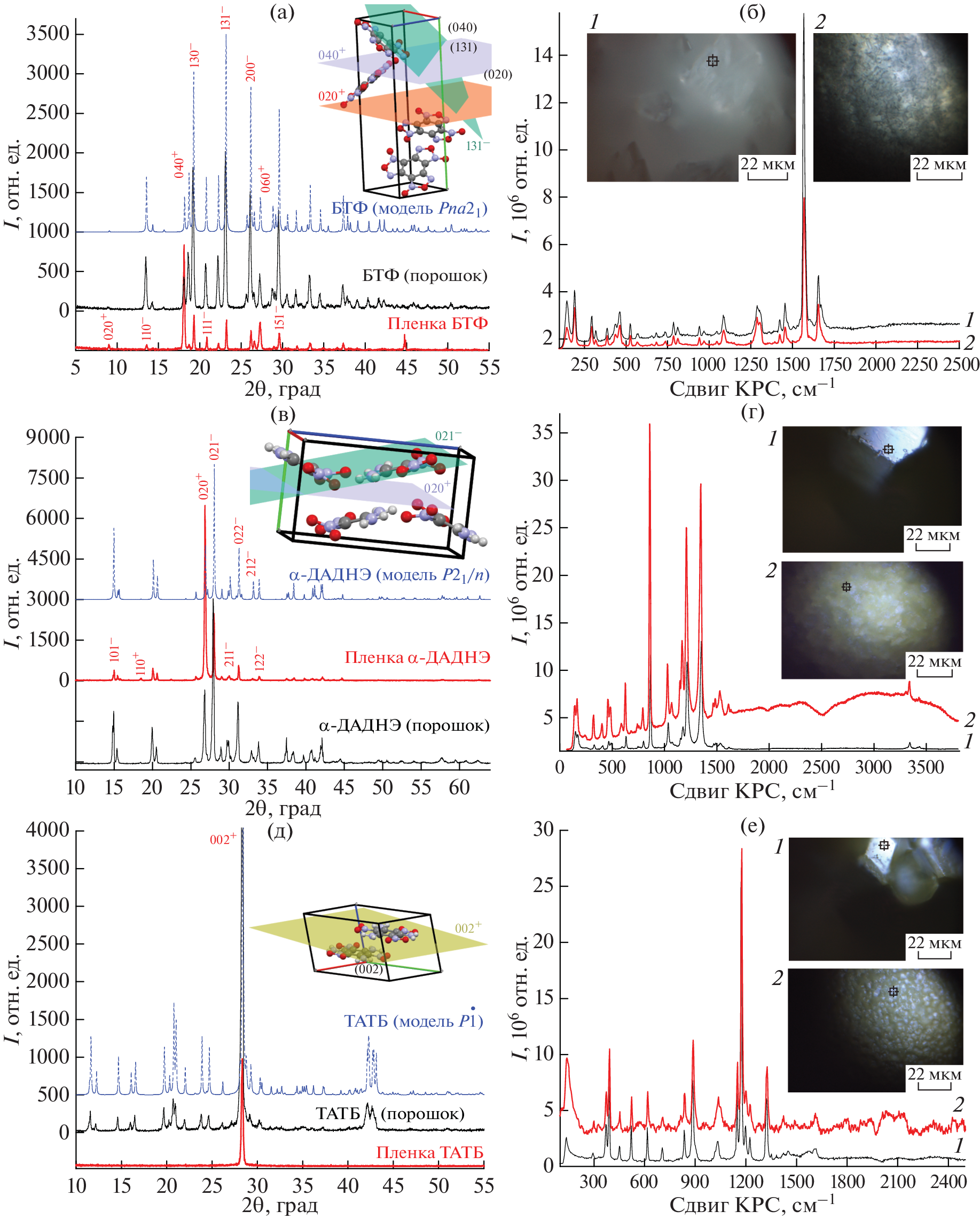 Тонкая кристаллическая структура, спектральные свойства и микроморфология поверхности пленок 1,3,5-триамино-2,4,6-тринитробензола, 1,1-диамино-2,2-динитроэтилена и бензотрифуроксана, полученных методом кристаллизации из газовой фазы