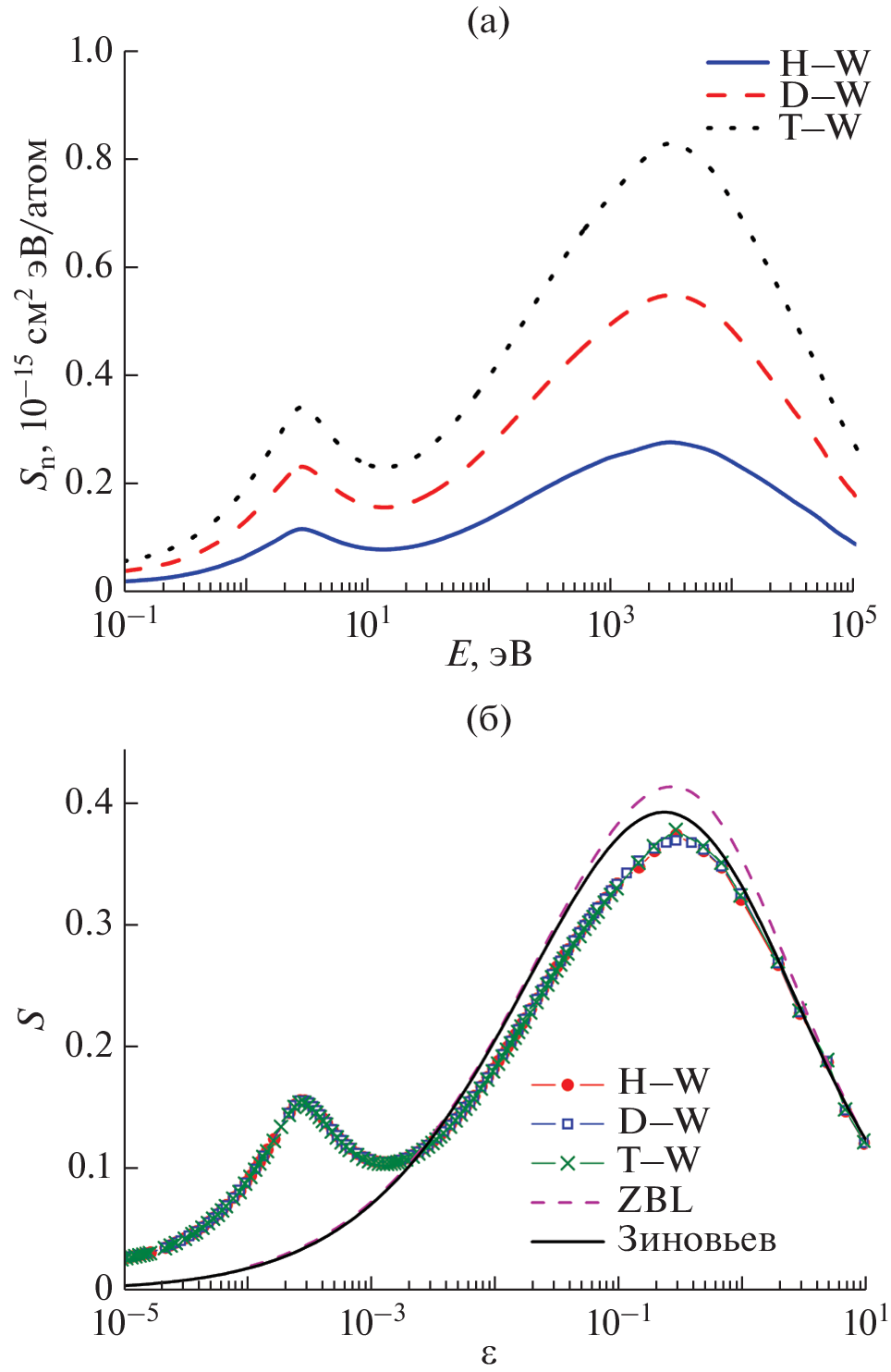 С использованием потенциалов взаимодействия, полученных в рамках теории функционала плотности, рассчитаны ядерные тормозные способности для систем H, D, T–Be, C, W, необходимые для расчета взаимодействия плазма–стенка в термоядерных исследованиях, а также для систем Kr–Si, Kr–Ge, O–Si, применяемых при ионной имплантации в полупроводники. В диапазоне значений энергии столкновения 10–1000 эВ полученные данные отличаются от данных SRIM на 15–70%. Наличие потенциальной ямы приводит к появлению дополнительного пика на зависимости сечения ядерного торможения при низких энергиях. Сравнение классических расчетов транспортного сечения с квазиклассическими показало их идентичность при энергии до 0.3 эВ.