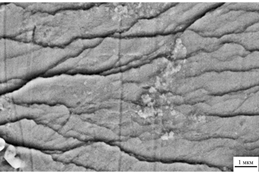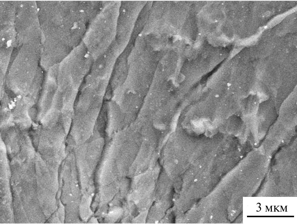 На рис. 8 показано изображение поверхности после деформации методом КВД, полученное с помощью растрового электронного микроскопа. Видно, что на поверхности присутствуют многочисленные ступеньки. Ступеньки имеют неровную форму и разную высоту. Расстояние между ступеньками меняется от нескольких десятков нм до нескольких мкм.