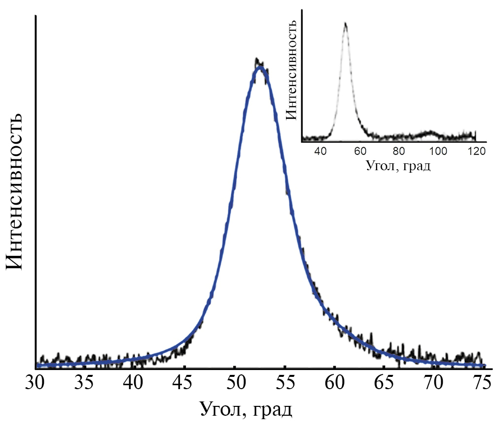 Рис. 7. Рентгенограмма образца аморфного сплава Fe76Si13B11, деформированного методом КВД (e = 5.95): область первого диффузного максимума и полная рентгенограмма (на вставке). Черная кривая – экспериментальные данные, синяя – кривая, описывающая рассеяние от аморфной фазы.