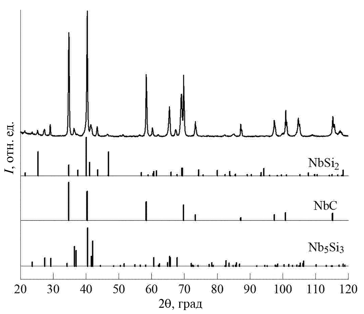 Ранее [24] при получении подобного сплава не было обнаружено формирования предполагаемой МАХ-фазы Nb2SiC. При синтезе MAX-фазы Ti3SiC2 из-за потерь кремния в процессе реакции рекомендовано обеспечить в составе исходных порошковых смесей избыток Si относительно расчетного [25]. С учетом этого в настоящей работе количество карбида SiC брали на 10% выше относительно стехиометрии предполагаемой MAX-фазы Nb2SiC.