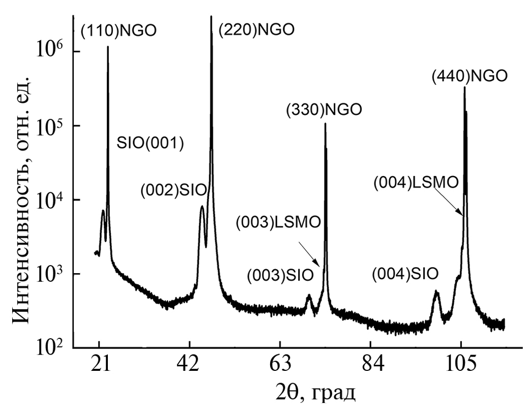 Рис. 1. Рентгеновская дифрактограмма от гетероструктуры SrIrO3/La0.7Sr0.3MnO3. Показаны индексы отражений от SrIrO3 (SIO), La0.7Sr0.3MnO3 (LSMO) и подложки NdGaO3 (NGO)