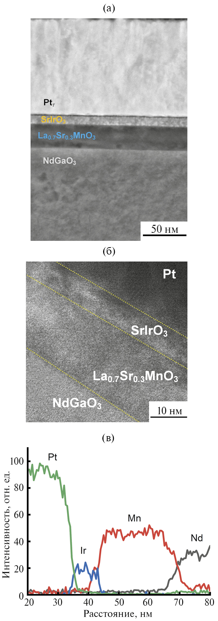 Рис. 2. а – Поперечное сечение гетероструктуры SrIrO3/La0.7Sr0.3MnO3 на подложке NdGaO3, полученное на просвечивающем электронном микроскопе. PtT – технологическая пленка платины нанесенная на гетероструктуру активным химическим распылением. б – Сечение в увеличенном масштабе. в – Послойный элементный состав гетероструктуры