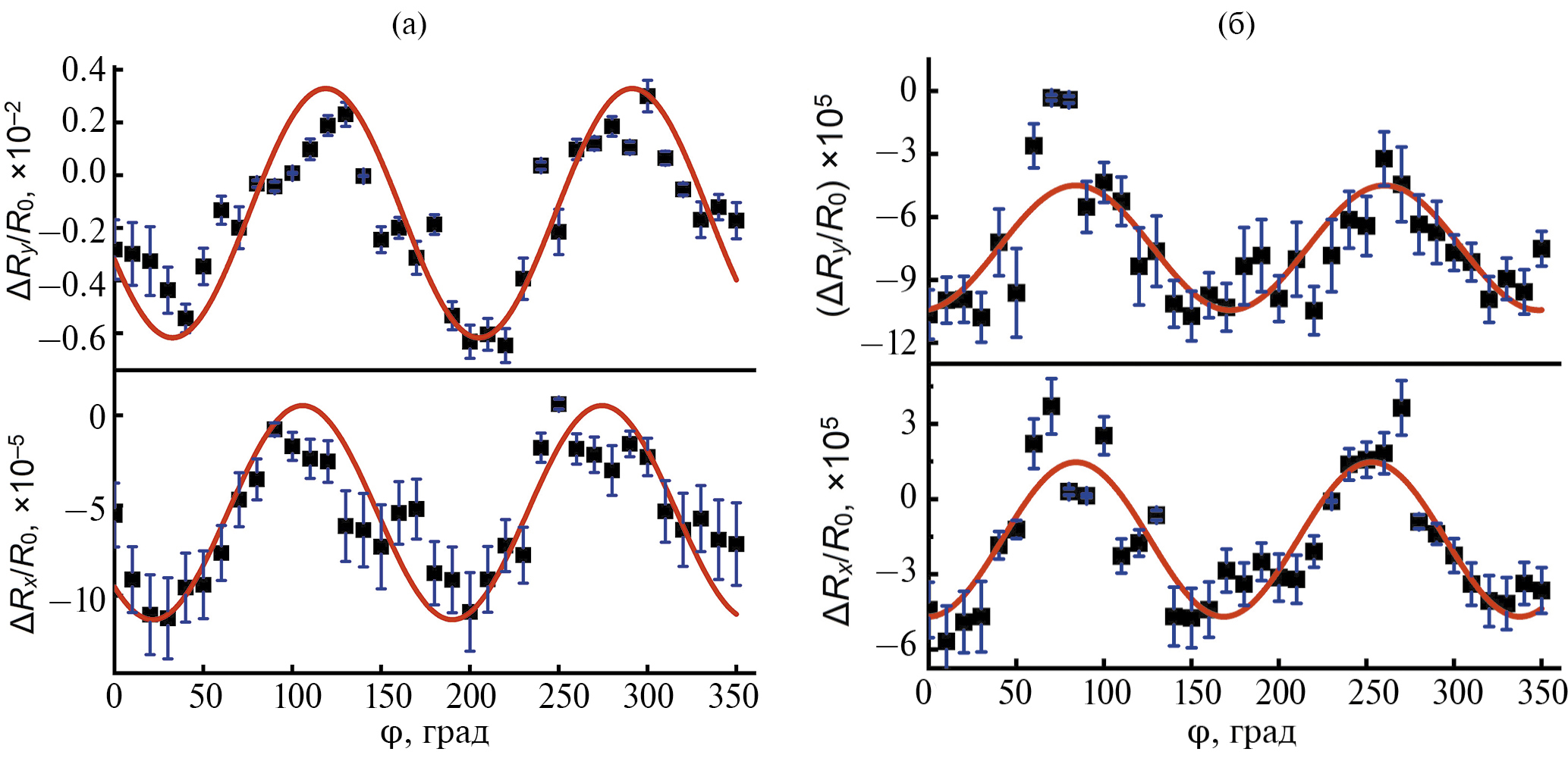 На рис. 5б представлена угловая зависимость поперечного магнитосопротивления ΔR/R0(φ) гетероструктуры SrIrO3/La0.7Sr0.3MnO3. Наблюдаемая в эксперименте зависимость представляет собой последовательное включение планарного холловского сопротивления из-за планарного эффекта Холла (PHE) ферромагнитной пленки La0.7Sr0.3MnO3 и поперечного спинового магнитосопротивления гетероструктуры SrIrO3/La0.7Sr0.3MnO3 [6, выражения (48) и (50)].