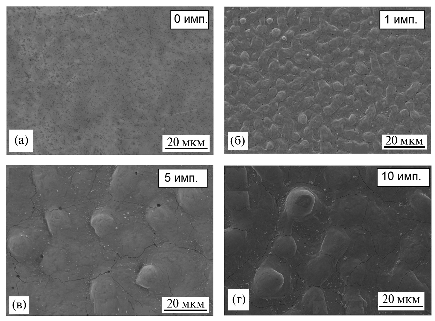 Рис. 2. РЭМ-изображение поверхности исходного образца WС-Co (a) и облученного ионным пучком с 1 (б); 5 (в); 10 (г) импульсами. Плотность энергии ИИП 7–8 Дж/см2