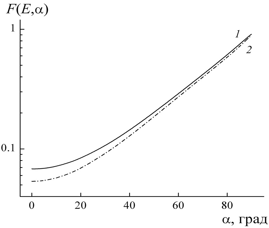Во всем диапазоне углов падения коэффициент отражения F(E, α) превышает несколько процентов. При увеличении угла падения α коэффициент отражения F(E, α) монотонно возрастает и стремится к единице при скользящих углах падения α → 90°. Уменьшение коэффициента F(E, α) с увеличением энергии E в области небольших α объясняется уменьшением потока электронов в поверхностных слоях мишени. Коэффициент отражения при падении электронов вдоль нормали к поверхности F(E, α = 0) уменьшается при увеличении энергии электрона (рис. 1). Эта особенность характерна для всех материалов от бериллия до урана [7]. Количество электронов, отраженных углеродной мишенью с энергией E < 50 кэВ, превышает 5% во всем диапазоне углов падения.