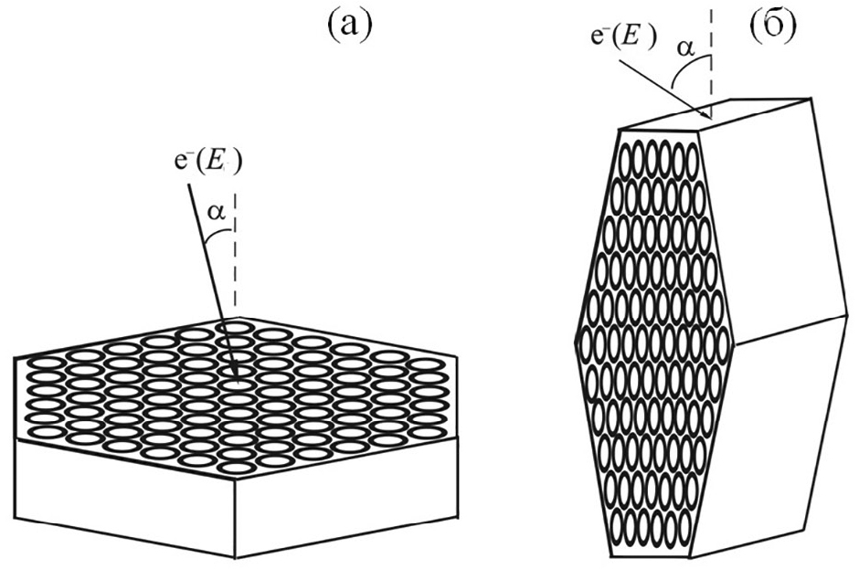 Рис. 2. Варианты расположения кластера из NCNT = 91 однослойных УНТ по отношению к пучку электронов, падающих на мишень под углом α к нормали, которая ориентирована: a – вдоль оси трубок; б – перпендикулярно оси трубок при угле между плоскостью рассеяния и направлением УНТ φ = 0°.