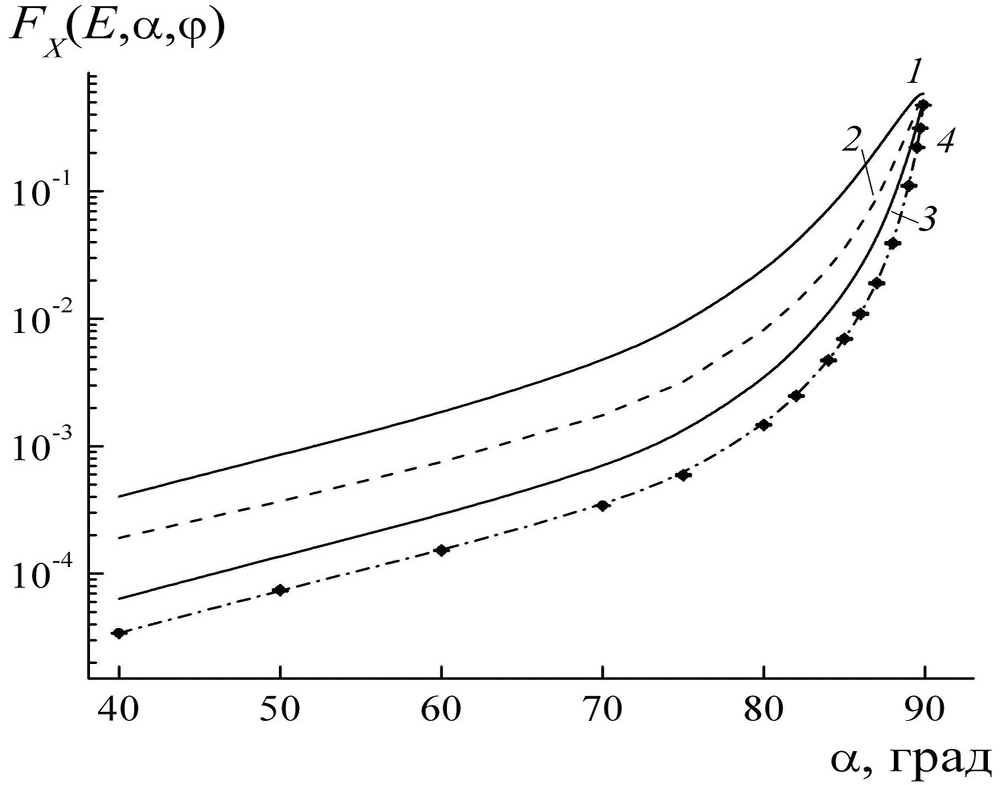 При углах падения α < 80°–85° количество отраженных слоем горизонтально расположенных УНТ составляет менее 1% (рис. 4). В области скользящих углов падения α > 85° электроны попадают в режим каналирования внутри кластера из УНТ и остаются в поверхностном слое мишени. В этом режиме рассеяние электронов на стенках УНТ может привести к изменению направления их импульса, в результате которого они начнут движение в направлении поверхности. Отличие Fx(E, α, φ) на несколько порядков от F(E, α) при небольших углах падения α < 60° объясняется тем, что электроны с энергией E > 10 кэВ в этом случае легко проходят через стенки отдельных нанотрубок и попадают в достаточно глубокие слои мишени. Вероятность выхода на поверхность мишени таких электронов быстро уменьшается при увеличении глубины проникновения в слой и угла падения.
