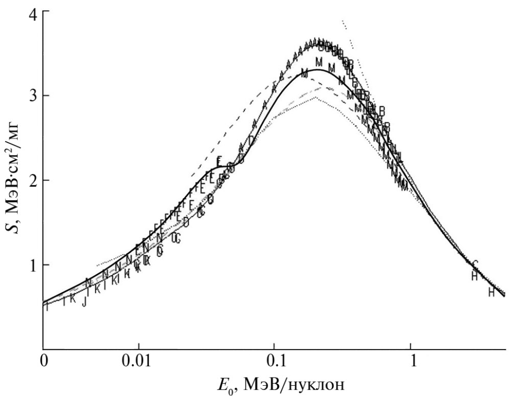 На рис. 1 две кривые представляют распределения электронной тормозной способности алюминия для ионов лития, рассчитанные по формуле (1): при ε1i = 6.0 эВ (сплошная кривая) и при ε1i = 7.0 эВ (штрихпунктирная кривая). Видно, что в сравнительно узком диапазоне энергии ионного пучка на кривых S(E) энергетических распределений присутствует характерная особенность в виде “ступеньки”. Появление такой особенности связано напрямую с тем, что зарядовое состояние ионного пучка в этой области энергии достигает своего минимального и равновесного значения zeq. Функция zeff в формуле (2) превращается в константу, а ее производная – в ноль, что и вызывает указанную особенность в распределении S(E). Дальнейшее уменьшение энергии пучка ионов сопровождается снижением S, которое пропорционально скорости пучка заряженных частиц [9, 12]. Видно, что уменьшение параметра ε1i всего на 1 эВ приводит к снижению максимума тормозной способности вещества и к его смещению в сторону больших значений энергии. Из сопоставления выполненных расчетов с большим массивом экспериментальных данных, взятых из компиляции Х. Пауля [11], следует, что в отсутствие какой-либо информации о величинах ε1i в проведенных экспериментах они достаточно хорошо соответствуют друг другу. На рис. 2 сплошная кривая отражает рассчитанное энергетическое распределение тормозной способности углерода для пучка ионов лития, выполненное с теми же параметрами для ионов, что и для алюминия (рис. 1). Из-за естественных различий в значениях параметров электронных оболочек атомов углерода и алюминия, которые во многом определяют поведение функции в (1), “ступенька” в распределении S(E) становится более широкой. Рост равновесного заряда zeq (в ряду ионов от лития к углероду) с одновременным уменьшением параметра β приводит к формированию распределений S(E) углерода для ионов бериллия, бора и углерода, которые изображены на рис. 3–5 сплошными линиями. Сопоставление этих энергетических распределений с экспериментальными значениями тормозной способности алюминия и углерода для пучков ионов лития, бериллия, бора и углерода позволяет сделать следующий вывод. При имеющемся в научных публикациях разбросе измеренных значений тормозной способности методика [9], основанная на учете зависимости зарядового состояния ионов пучка от отношения скорости ионов к минимальной скорости электронов вещества, позволяет проводить расчеты тормозной способности S вещества для пучка ионов средних и низких энергий, соответствующие экспериментальным результатам.