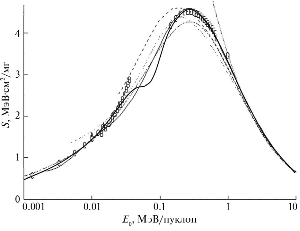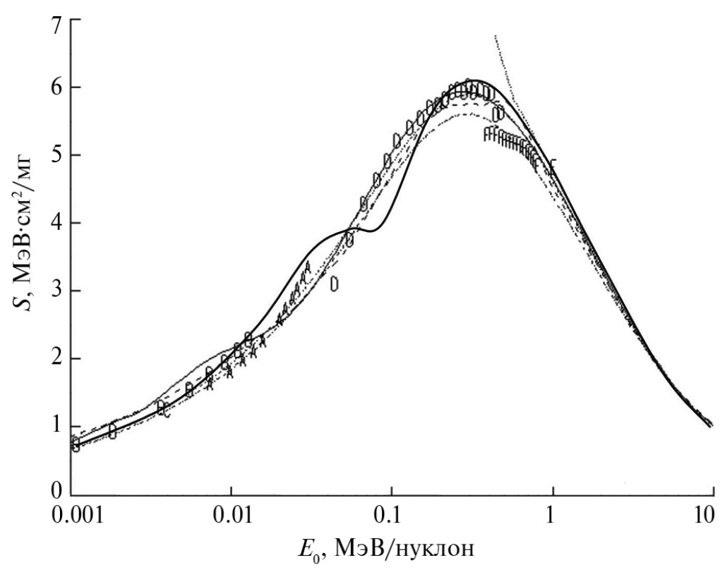 Полученные значения параметров β, feq и zeq для пучков ионов лития, бериллия, бора и углерода были использованы при проведении модельных расчетов тормозной способности ряда веществ по формуле (1). Результаты расчетов и сравнение полученных функциональных распределений S = F(E0) с экспериментальными данными приведены на рис. 1–5.