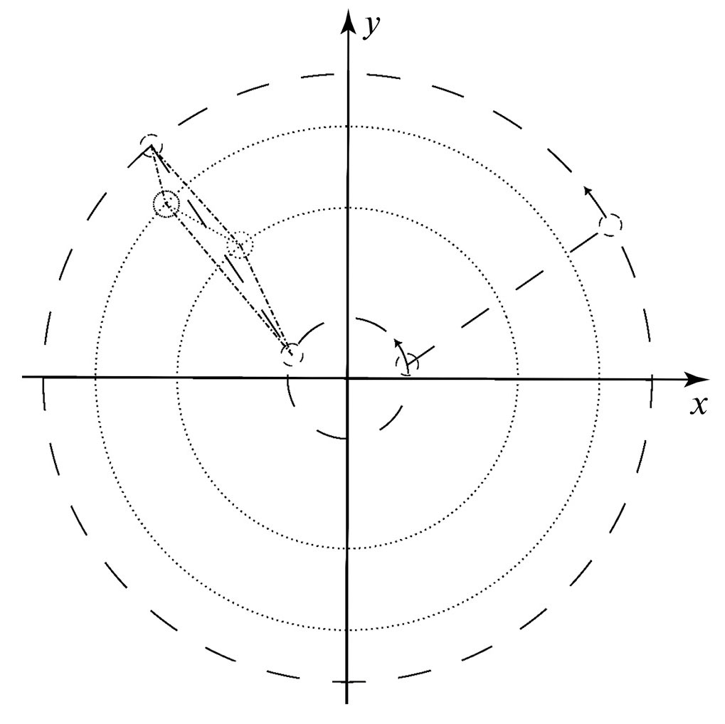 Рис. 4. Схематичное представление процедуры оптимизации относительного положения подсистем A и B. Точечным пунктиром показано положение подсистемы A, пунктиром положение подсистемы B, штрих-пунктиром – ожидаемое положения подсистемы B относительно подсистемы A.