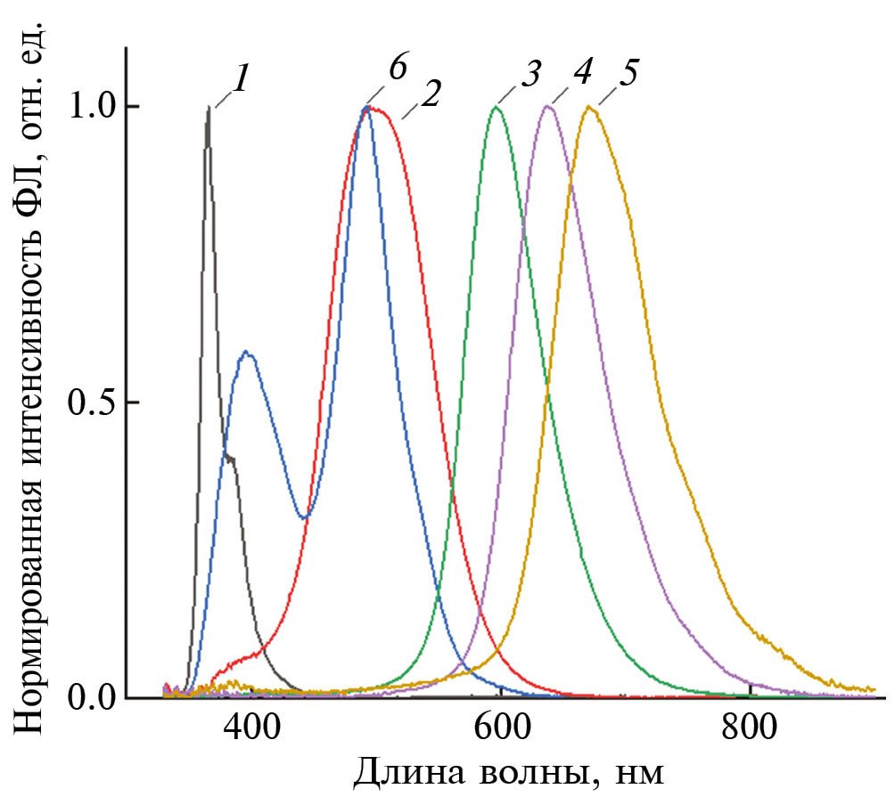 На рис. 2 представлены нормированные спектры ФЛ от выращенных образцов, полученные при комнатной температуре. Установлено, что при уменьшении суммарной величины потоков FIII от 5 до 2 × 10–7 Торр положение максимумов ФЛ смещается в область увеличения длины волны (с 366 к 670 нм), однако при дальнейшем снижении FIII наблюдается обратная ситуация (кривая 6 на рис. 2). Кроме того, данный образец демонстрирует два пика ФЛ, что дополнительно подтверждает образование твердых растворов InxGa1–xN с различным составом по x [17].