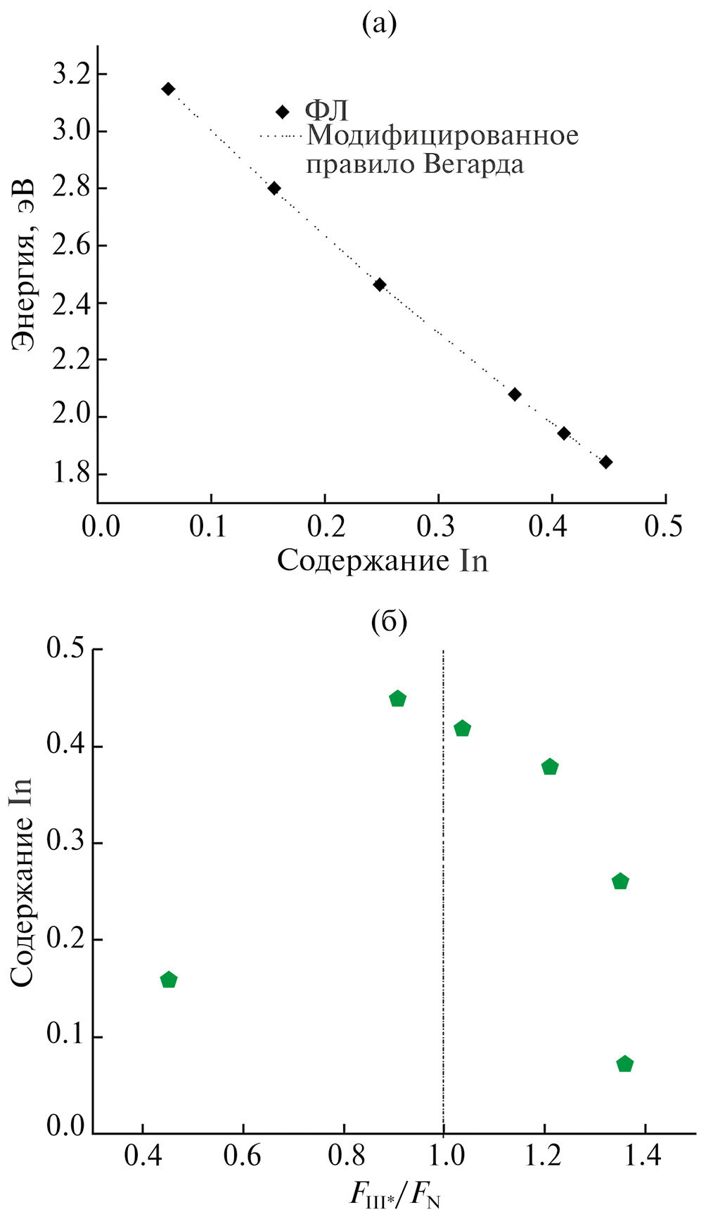 Как было показано ранее, содержание In в InGaN в диапазоне от 0 до 50% можно оценить с помощью спектров ФЛ [10, 12, 13, 19, 20] по модифицированному правилу Вегарда, учитывающему параметр изгиба b = 1.43 эВ: Eg = xEgInN + (1 – x)EgGaN – bx(1 – x), где EgInN и EgGaN – ширины запрещенных зон InN и GaN (0.7 и 3.4 эВ соответственно), x – содержание In в InGaN. На рис. 3а представлена зависимость максимумов ФЛ от содержания In в InGaN, построенная по модифицированному правилу Вегарда. Для образцов, у которых наблюдали несколько максимумов ФЛ, оценивали среднее содержание индия между данными максимумами. Результаты показывают, что в выращенной серии образцов среднее содержание In составляет от 7 до 45%. С учетом химического состава в твердом растворе InGaN был рассчитан коэффициент встраивания In αIn и FIII* по формулам выше. Затем построена зависимость содержания In от соотношения потоков элементов FIII*/FN с учетом десорбции In с ростовой поверхности (рис. 3б). На рис. 3б пунктирной кривой обозначена граница FIII*/FN = 1. При FIII*/FN > 1 наблюдали снижение содержания In, что связано с переходом в промежуточные и затем металл-обогащенные условия роста. В свою очередь, при относительно небольших значениях FIII*/FN, близких к 0.9, содержание In составило ~45%. Дальнейшее уменьшение FIII*/FN привело к снижению содержания In в нанокристаллах InGaN.