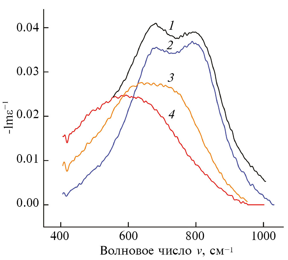 Рис. 3. Спектральные зависимости функции энергетических потерь Imε–1, кристалла Bi0.6Sb1.4Te3 при температурах 78 (1); 101 (2); 173 (3); 292 К (4), рассчитанные при помощи соотношений Крамерса–Кронига из спектров коэффициента отражения R.