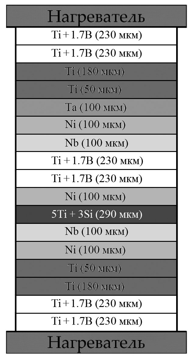 В работе использовали коммерческий порошок Ti (ПТС-1, средний размер частиц d = 40 мкм и чистотой 99%), аморфный бор (чистотой 99.4%), кремний (d < 10 мкм, чистотой 99.4%) и фольги металлов Ti (ВТ-0, толщиной 50 мкм и 180 мкм), Nb (Нб-1, толщиной 100 мкм), Ta (ТВЧ, толщиной 100 мкм) и Ni (НП2М, толщиной 100 мкм).