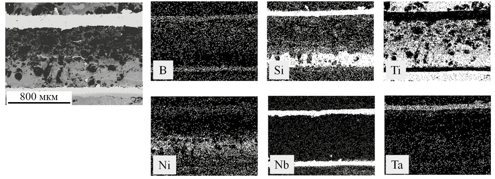 Кроме этого на цифровом сканирующем микроскопе LEO 1450 VP (Carl Zeiss, Германия) с энергодисперсионным спектрометром INCA Energy 350 с полупроводниковым Si(Li) детектором INCA x-sight были получены карты распределения характеристического рентгеновского излучения B, Si, Ti, Nb и Ta синтезированного образца (рис. 2).