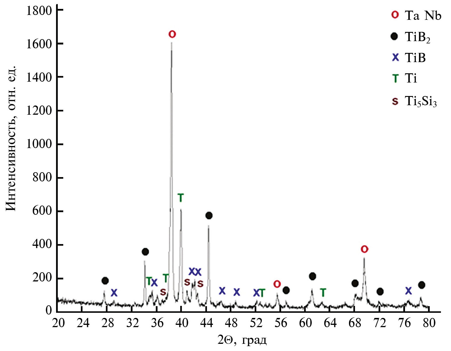 Данные рентгенофазового анализа (рис. 3), снятые с боковых поверхностей образцов, хорошо согласуются с данными растровой электронной микроскопии. По результатам РФА в образце присутствуют фазы TiB (орторомбическая структура) и TiB2 (гексагональная структура), фазы металлов титана (гексагональная структура), тантала (объемноцентрированная кубическая структура), ниобия (объемноцентрированная кубическая структура) и небольшое количество силицида титана Ti5Si3 (гексагональная кристаллическая структура). Наличие низшего силицида Ti5Si3 благоприятно сказывается на жаростойкости материала и улучшает свойства материалов при высоких температурах, так как при его образовании объемные изменения меньше, чем при образовании высших силицидов [27].
