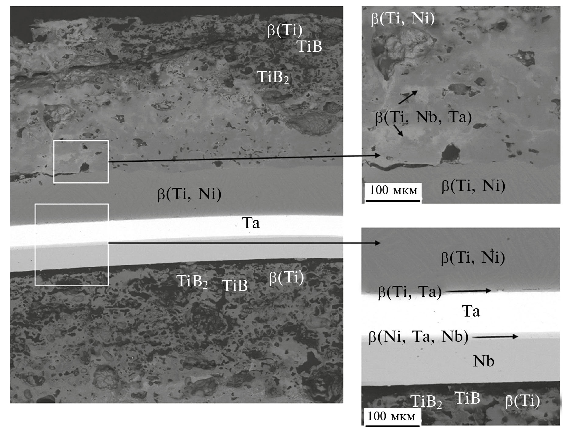 Исследование морфологии синтезированных образцов показало формирование ровных сплошных соединений между металлическими фольгами (L3–L7, табл. 2), образованных твердыми растворами β-(Ti, Ta), β-(Ni, Ta, Nb) и β-(Ti, Ni) (рис. 4). Формирование β-(Ti, Ta) в условиях самораспространяющегося высокотемпературного синтеза происходит в результате взаимной диффузии титана и тантала, но при температуре синтеза (>2500°C) коэффициент диффузии титана в пять раз выше, чем коэффициент диффузии тантала, т.е. можно предположить, что в результате синтеза на поверхности титановой фольги происходит частичное плавление, которое способствует диффузии атомов титана на поверхность танталовой фольги [13, 28, 29]. При образовании твердого раствора β-(Ni, Ta, Nb), соединяющего фольги тантала и ниобия (L5–L7, табл. 2), основную роль сыграло полное плавление никелевой фольги, которое способствовало взаимной диффузии тантала, ниобия и никеля. В соответствии с диаграммой состояния ниобий и тантал образуют твердый раствор, а высокие температуры синтеза увеличивают диффузию атомов [30]. Кроме того, Ta, Nb и Ni обладают пластичностью, и образованный твердый раствор позволит уменьшить напряжение на границе раздела и внутреннее напряжение в соединении, тем самым улучшая прочностные характеристики материала [31]. Твердый раствор β-(Ti, Ni), образован в результате диффузии никеля в титан (L3–L4, табл. 2). Можно предположить, что в результате синтеза произошло плавление титановых фольг, что подтверждается волнистой формой промежуточного слоя. В верхней части образца (L1–L2, табл. 2), в результате горения реакционных лент (Ti + 1.7B) сформировался слой металлокерамики: зерна TiB и TiB2 равномерно распределены в расплаве титана. Структура этого слоя идентична слоям образца, в состав которых входили ленты (Ti + 1.7B) (L1–L2, L8–L9, L16–L17, табл. 2), т.е. независимо от расположения реакционных лент в результате синтеза формировалась металлокерамика на основе зерен TiB и TiB2, равномерно распределенных в титановой связке (рис. 4, рис. 5) [32]. Эти данные хорошо согласуются с данными рентгенофазового анализа (рис. 3). При более детальном изучении морфологии нижних слоев образца было обнаружено, что в отличие от слоев L1–L2, L8–L9, где присутствие никеля в β-Ti незначительно, в слоях L16–L17 зерна TiB и TiB2 распределены в твердом растворе β-(Ti, Ni). Наличие никеля объясняется полным плавлением никелевых фольг и активной диффузией атомов никеля, что подтверждается картой распределения элементов (рис. 2).