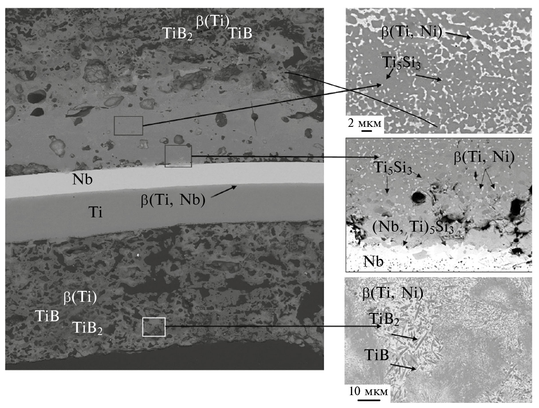Соединение титановой и ниобиевой фольг (L12–L15, табл. 2) произошло в результате формирования промежуточного слоя, образованного твердым раствором β-(Ti, Nb) (рис. 5) [10]. На границе ниобиевой фольги и слоя металлокерамики (L11–L12, табл. 2), образованной в результате горения реакционной ленты (5Ti + 3Si) сформировался промежуточный слой β-(Nb, Ti)5Si3, который обладает большей пластичностью и более низким коэффициентом термического расширения по сравнению с фазой Nb5Si3 [33] (рис. 5). Плавление никелевой фольги способствовало прямому образованию Ti5Si3 и однородности слоя, кроме этого, связующий эффект Ni для Ti5Si3 способствовал улучшению вязкости всего материала и повышению плотности [34].