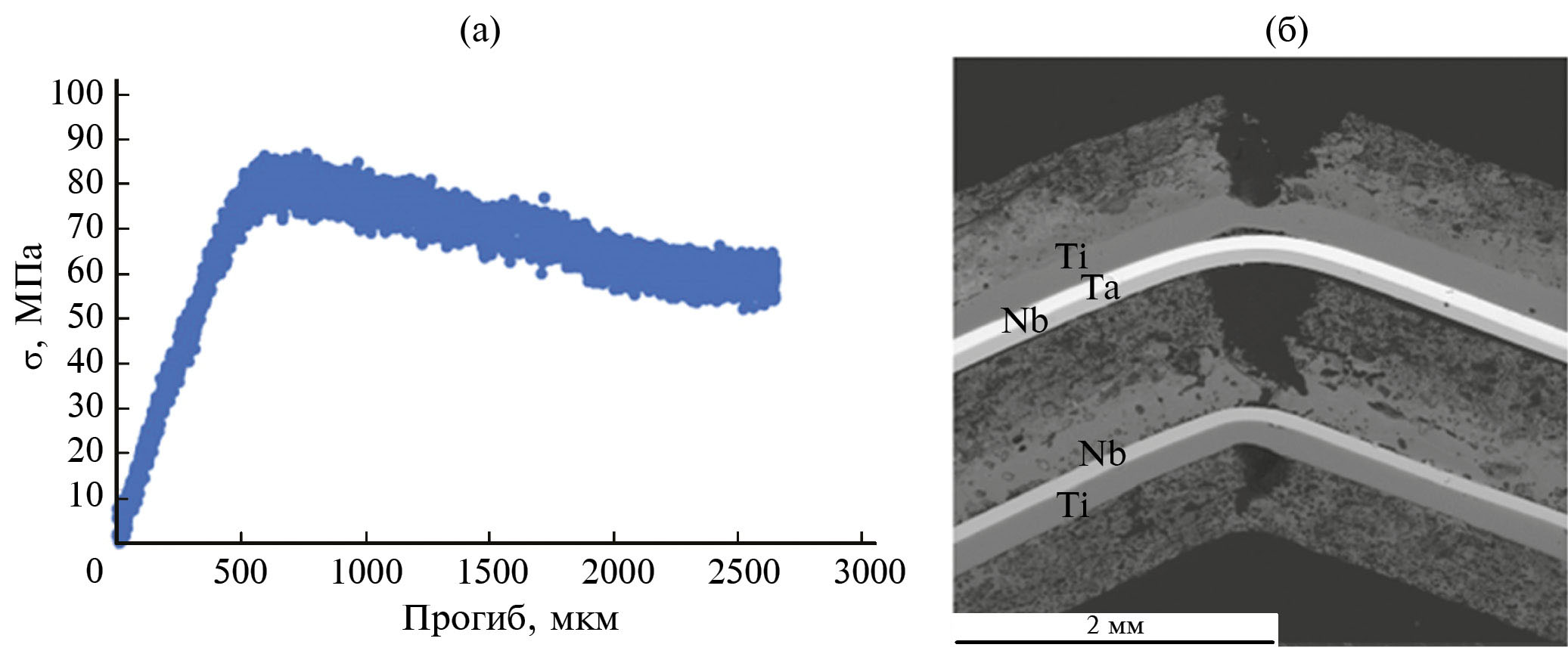При оценке прочностных свойств полученного слоистого композита в процессе испытаний на трехточечный изгиб вели запись вели запись нагрузки – прогиба образца (рис. 6). На кривой видно, что до 73 ± 10 МПа происходит упругая деформация, предел прочности достигается при 87 ± 10 МПа, далее имеет место вязкий характер разрушения образца. Однако не происходит полного разрушения образца: фольги металлов (Ta, Nb) обладают высокой пластичностью, а промежуточные слои, сформированные твердыми растворами, снижают концентрацию термических напряжений. Трещина распространяется по керамике, вдоль направления нагрузки. Следует отметить, что рассеяние энергии происходит в основном образованием магистральных трещин в слоях керамики, которые эффективно затормаживаются в вязких слоях твердого раствора и фольг чистого металла (рис. 6). Практически полное отсутствие трещин вдоль слоев указывает на высокую адгезию образовавшихся соединений с соседними слоями. Значения прочностных характеристик полученных образцов выше, чем прочностные свойства слоистых композиционных материалов, полученных в работе [13].
