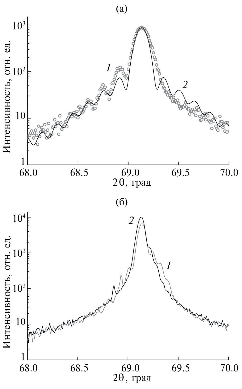 6. Рис. 5. Рентгенодифракционный анализ структуры КНИ: а – после имплантации бора с предаморфизацией ионами аргона (1 – эксперимент, 2 – подгонка); б – после отжига в режимах 1 (1) и 2 (2)