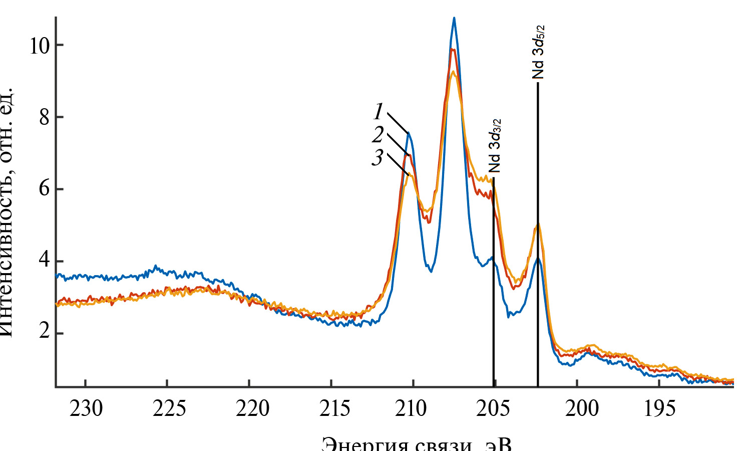 Модуль электронно-ионной спектроскопии оборудован полусферическим энергоанализатором SPECS Phoibos 225, рентгеновской пушкой SPECS XR50 с магниевым анодом и ионной пушкой SPECS Ion Source IQE 12/38. Энергоанализатор записывал рентгеновские фотоэлектронные спектры в режиме постоянной области анализа (Fixed Analyzer Transmission, FAT). Энергия замедления в линзе энергоанализатора для обзорных спектров составляла Epass = 80 эВ и для деталь- ных – Epass = 20 эВ. Для калибровки энергоанализатора использовали образцы из Cu, Ag и Au. Энергетическое разрешение спектрометра по линии Ag 3d5/2 составляло 0.78 эВ для немонохроматического рентгеновского MgKα-излучения.
