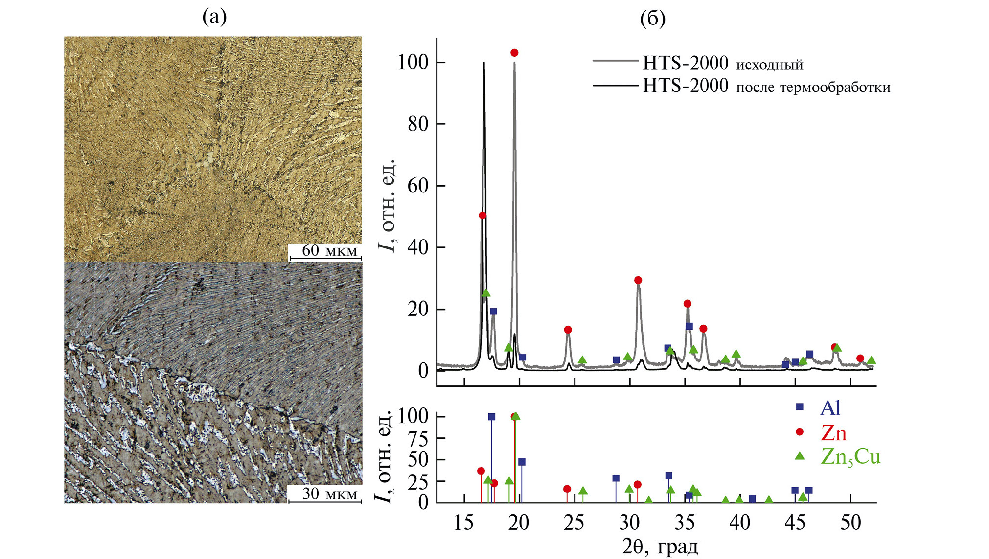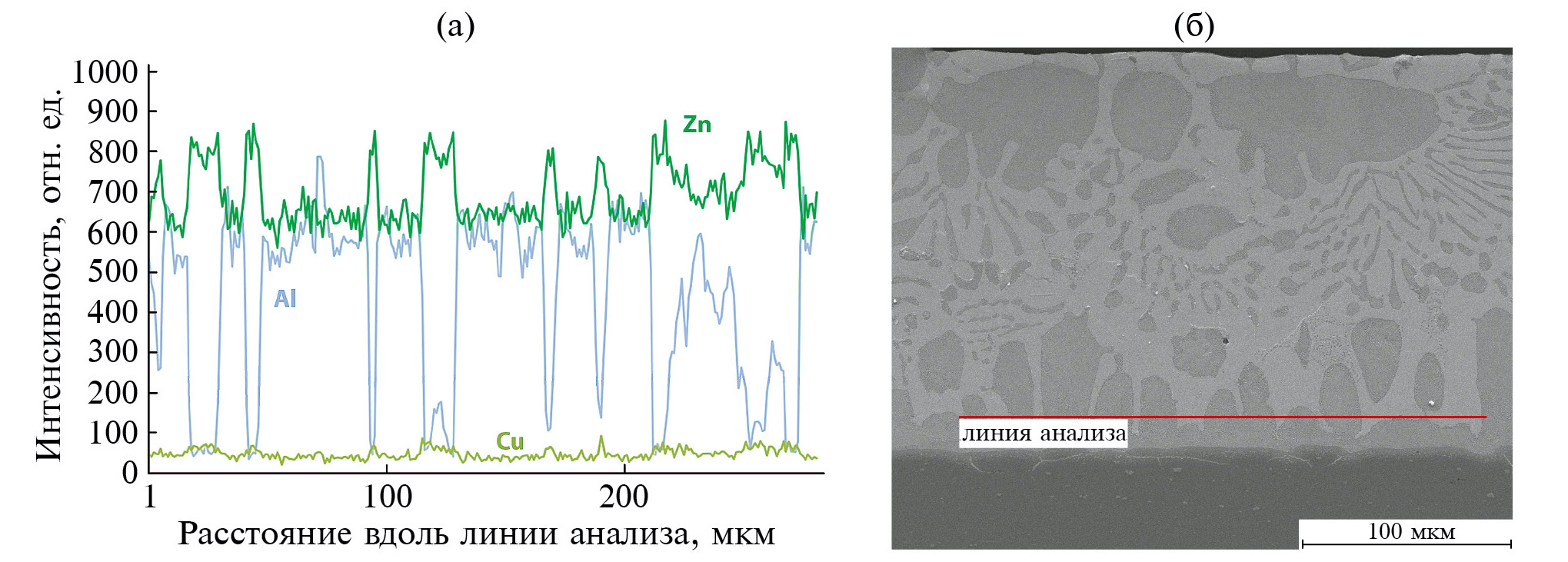 На рис. 3 приведены морфология (рис. 3а) и рентгенограмма (рис. 3б) полученных композитов из припоя и АМг6 после лужения. Уже на стадии лужения происходит активное взаимодействие Zn и Al, что приводит к образованию развитой морфологии в зоне соединения. Фазовый состав припоя после лужения качественно не меняется и состоит из твердых растворов на основе Al и Zn, а также интерметаллида Zn5Cu. Однако структура припоя, затвердевшего на поверхности АМг6, хотя и сохраняет следы эвтектической кристаллизации, становится намного грубее по сравнению с исходной мелкодифференцированной эвтектической структурой припоя. Вблизи поверхности подложки наблюдали вырожденную эвтектическую кристаллизацию, при которой столбчатые кристаллы фазы α растут от поверхности АМг6, и только после этого между ними образуются кристаллы фазы β и интерметаллида, а совместный эвтектический рост происходит только в верхней части луженого слоя. Такое изменение характера кристаллизации может быть вызвано не только влиянием диффузионных процессов и перераспределением компонентов между припоем и подложкой, но и изменением условий охлаждения. Исходный припой получают при закалке расплава, а образец после лужения затвердевает в условиях средних скоростей охлаждения.