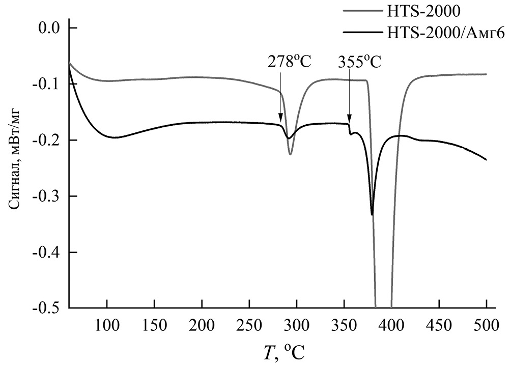 Для определения температуры при термообработке использовали данные дифференциальной сканирующей калориметрии (ДСК). ДСК исходного сплава АМг6, припоя HTS-2000 и сплава Zn–Al проводили на установке DSC 404 C Pegasus фирмы Netzsch с рабочим диапазоном от 50 до 1500°С с погрешностью ±3°С.