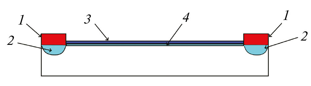 Рис. 1. Схема детектора: 1 — кремниевый фотоумножитель; 2 — линза типа “рыбий глаз”, заполненная клеем; 3 — сцинтиллятор ZnS:LiF; 4 — клеевая прослойка.