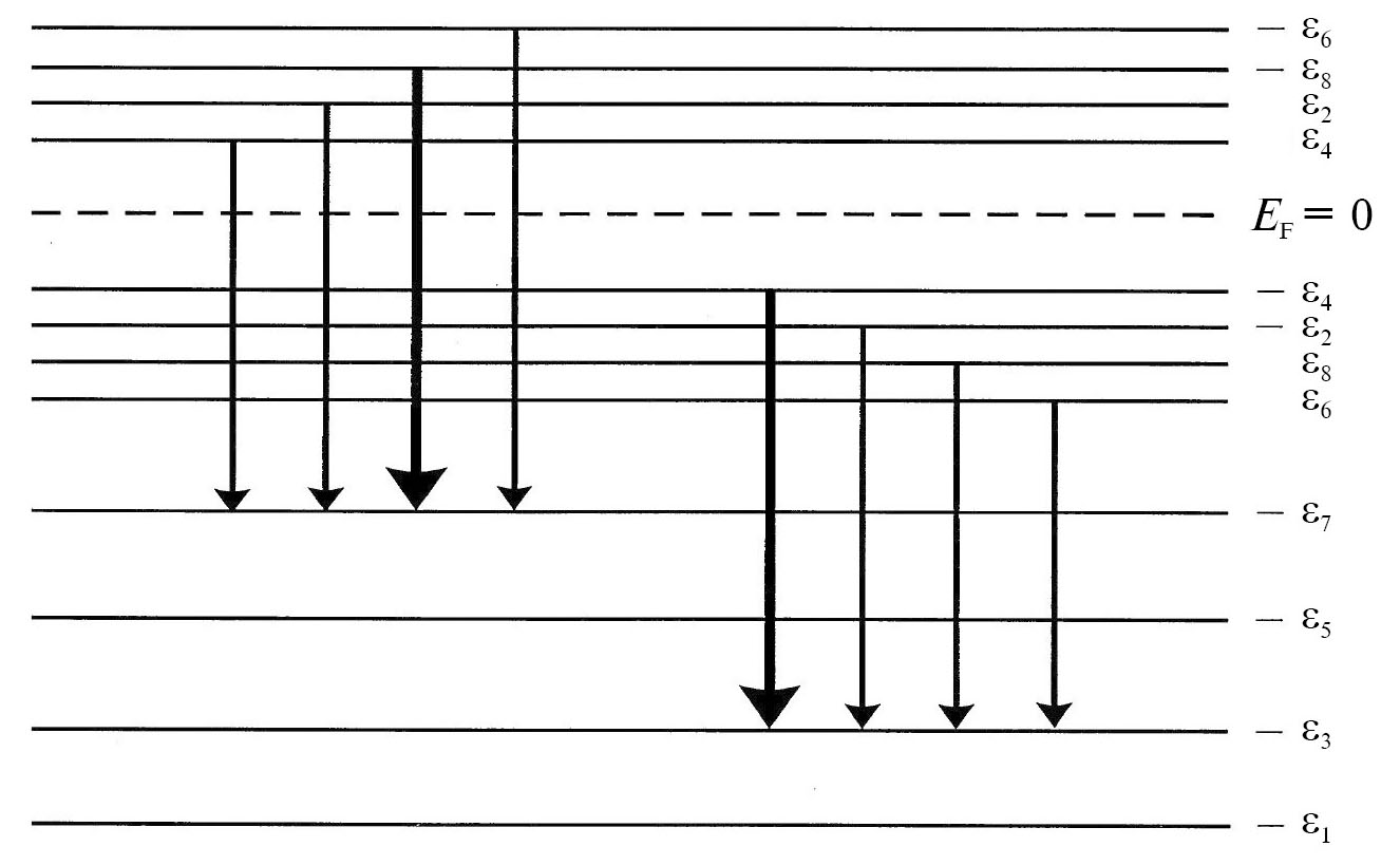 Ниже уровня Ферми спектр имеет симметричную описанной модели структуру ветвей. Его характерная особенность — появление восьми квазиоптических ветвей вблизи уровня Ферми как результат конденсации мягких квазиакустических мод с параметрами порядка Δq1, Δq2. Появление ветвей –ε6, –ε8 (ε8, ε6) связано с эффектом поднятия (опускания) уровней валентной зоны (зоны проводимости) ниже (выше) уровня Ферми. Ветви ε2, ε4 (–ε4, –ε2) образованы уровнями зоны проводимости (валентной зоны). С одной стороны, возникает ситуация типа фазового перехода диэлектрик–металл, когда уровни валентной зоны становятся выше уровней зоны проводимости. С другой стороны, при Δ = 0 (для кристаллографических направлений типа [111] с m2 = 0 либо для ионов в состоянии с nF2 = 0) имеет место попарное вырождение энергии –ε6 = –ε8, ε2 = ε4. Конденсация мягкой квазиоптической моды с Δ ≠ 0 приводит к снятию указанного вырождения. С увеличением Δ внешние ветви –ε6, ε4 квартета расталкиваются, а внутренние ветви –ε8, ε2 сближаются и затем при некотором критическом значении Δ пересекаются (что указывает на возможную смену регулярного режима на стохастический в поведении физических параметров, связанных с данным спектром).