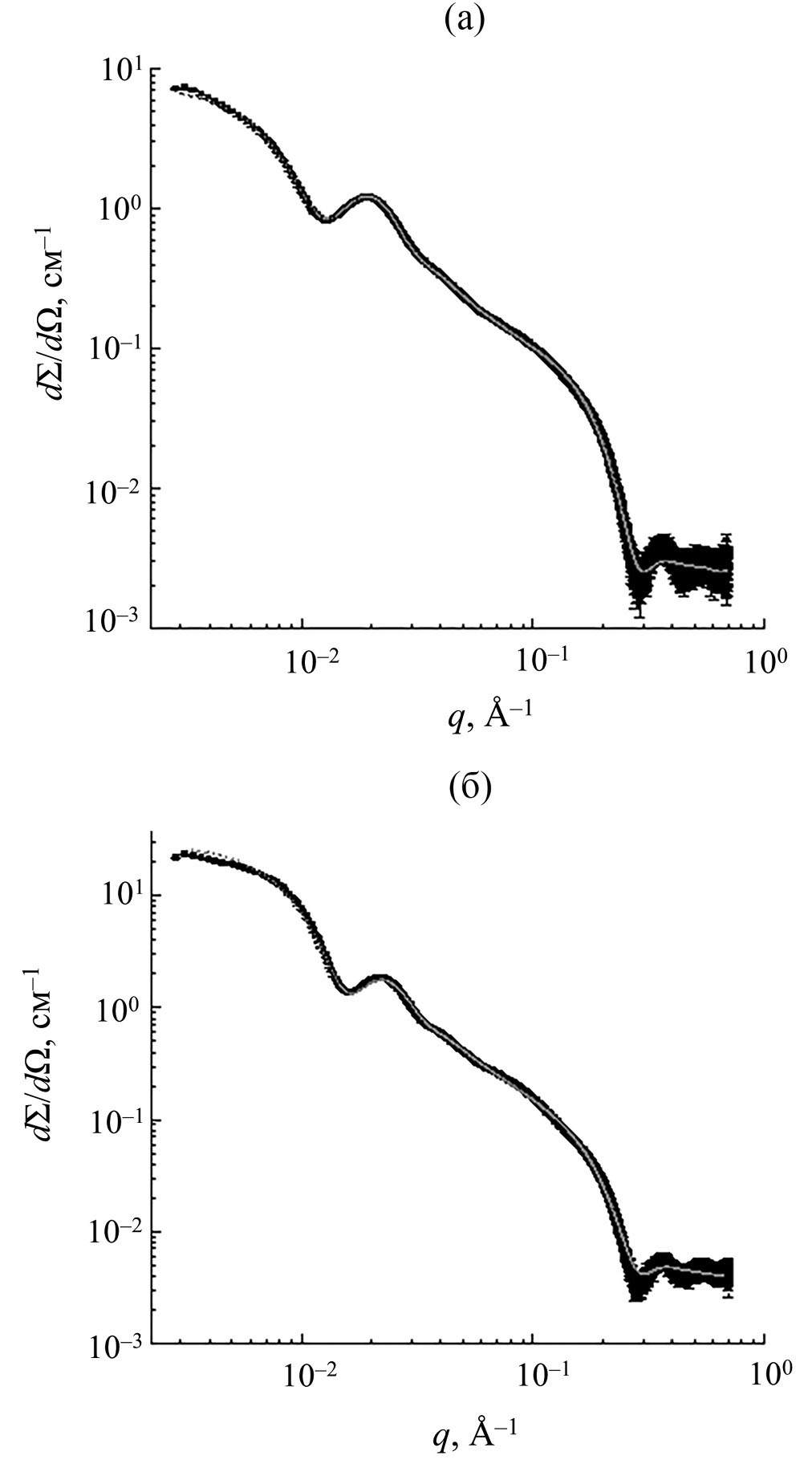 Рис. 2. Экспериментальные кривые малоуглового рассеяния (установка P12, PETRA III) везикул ФТНС при концентрации 20 (а) и 25% (б). Точки — эксперимент, сплошная линия — расчетная кривая.