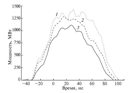 Рис. 1. Типичная временная зависимость мощности пучка электронов с энергией 120 (1); 100 (2) и 80 Дж (3), облучающего образец.