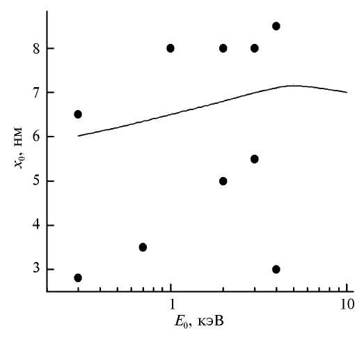 Рис. 4. Зависимость толщины измененного слоя от энергии ионов гелия (нормальное падение) при стехиометрическом распылении TaC: сплошная линия — расчет; символы — эксперимент [22].