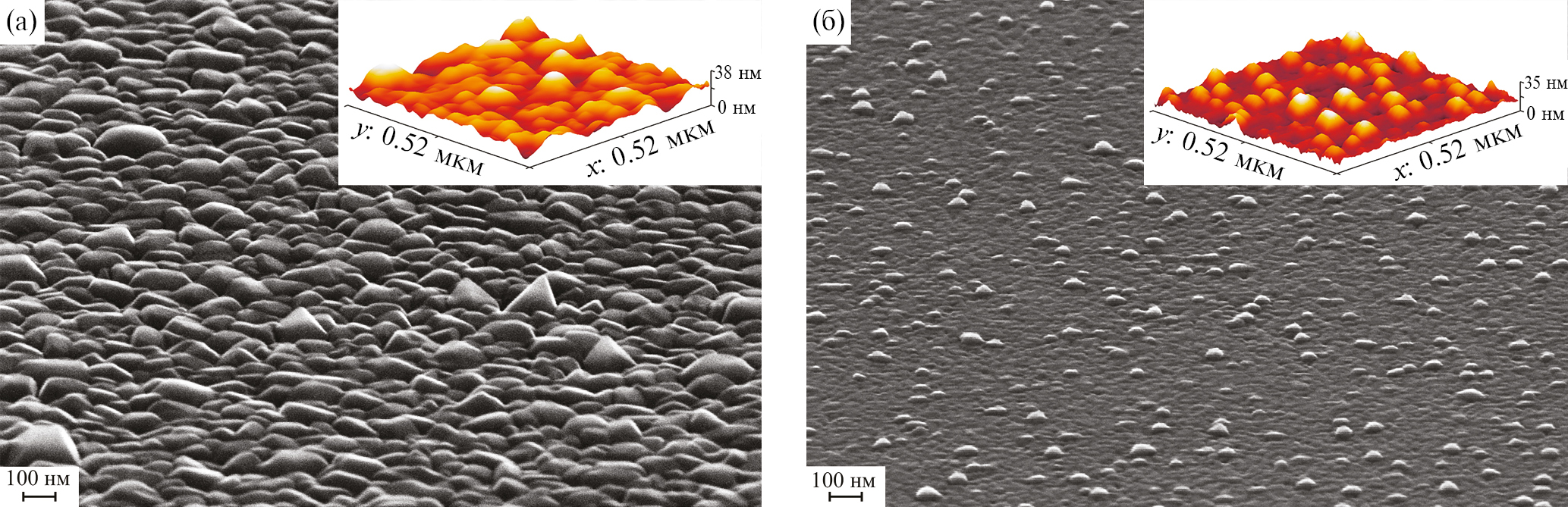 Рис. 3. РЭМ-изображения исходной пленки (а) и облученной ионами Ar+ с энергией 60 эВ (б). На вставках — изображения, полученные с помощью АСМ.