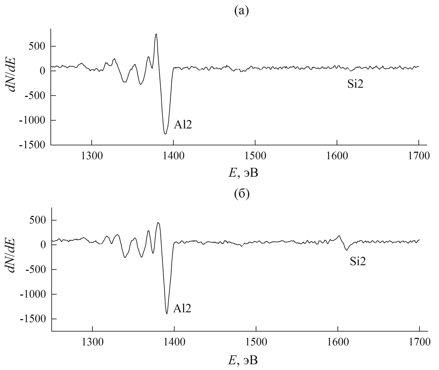 Рис. 5. Элементы высокоэнергетической части оже-спектра поверхности исходной пленки АК1 (а) и после распыления ионами Ar+ с энергией 60 эВ (б).