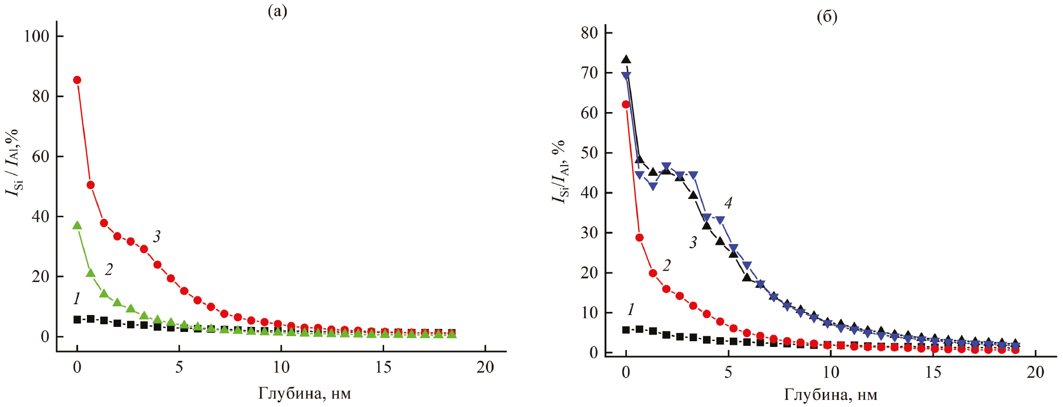 Рис. 6. Распределение Si в приповерхностном слое: а – исходной пленки (1) и после распыления ионами Ar+ с энергией Е = 100 эВ в течение t = 2 мин (2), Е = 40 эВ, t = 6 мин (3); б — исходной пленки (1) и после распыления ионами Ar+ с энергией Е = 45 эВ в течение t = 4 (2), 6 (3), 12 мин (4).